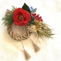 目を惹く赤の椿を正面に、右には水引付き扇を配した和モダンなお正月飾りです。