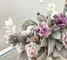 ピンクのミニバラと小花、木ノ実の横に天使か寄り添っています。天使の優しい微笑みに癒されるかわいい作品です。
