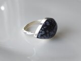 黒の地に白いドット模様が可愛い、スノーフレークオブシディアンのリングです。