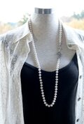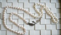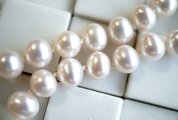直径8~9ミリ程度のややつぶれた形のポテトパールを1粒ずつシルク糸で結びながらつないでいったネックレスです。艶やかでとても美しいパールたちです。