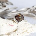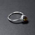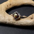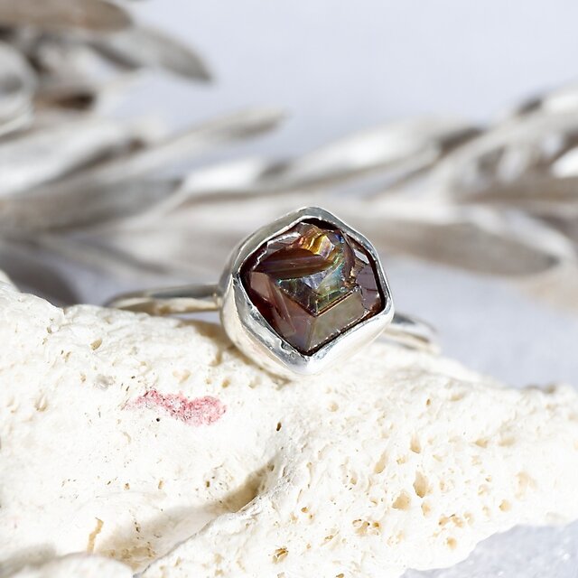 角度によって七色の輝きが浮かび上がるレインボーガーネットの結晶を、シンプルなリングに仕上げました。
