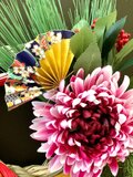 赤とピンクの可愛いダリアに紅白の水引と扇が華やかで豪華なしめ縄飾りを制作しました。