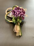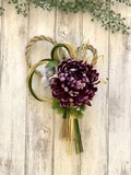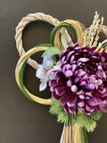華やかな紫ダリアに金と緑の水引としめ縄を重ねた豪華で上品なしめ縄飾りを制作しました。