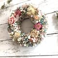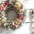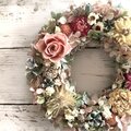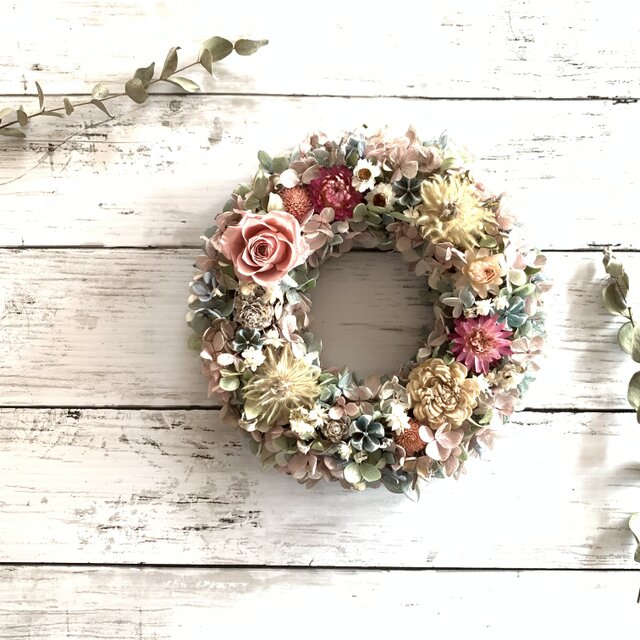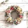 シックなピンクのバラとソーラーローズ・ドライフラワーの帝王貝細工やフィリカなどを使った落ち着いた雰囲気のリースです。