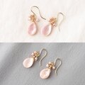 照りの美しい優しい色合いのピンクシェルにライトピンクの淡水パールを合わせた上品な雰囲気のピアスです。