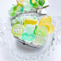 レモンの棒付きキャンディー、ビスケット、くまグミ、