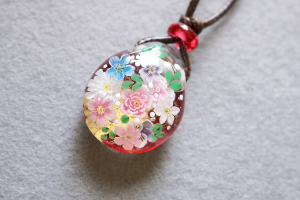 バーナーワークの技法で制作した、手作りのガラスのペンダントです。