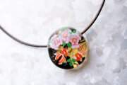 金箔を貼り付けた黒の地に、椿を咲かせ金魚を泳がせました。