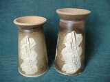 外側は白化粧土を刷毛塗りして、麦穂を掻き落し描き、灰釉掛けして1240度で焼き上げ、薪の煙で燻して(炭化焼成)こげ茶色に仕上げています。
