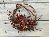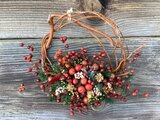 緩く丸めた柳小枝にノイバラの実、サルスベリの実、ブルーベリーリーフなどをギュッと詰めたシンプルなWreathです。