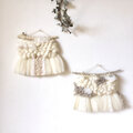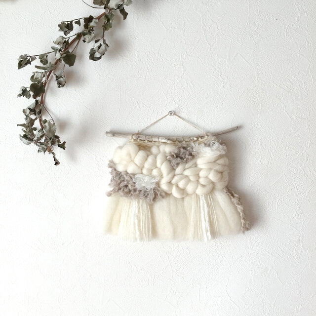 みるく色のふわふわクロスブレッドをたっぷり使用し、モヘアやファンシーヤーン等と組み合わせた優しく可愛らしいタペストリー。