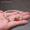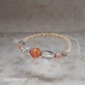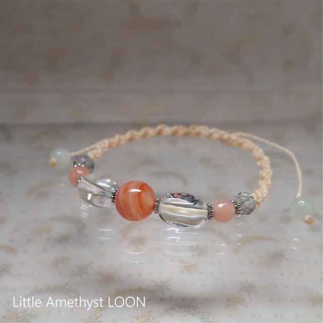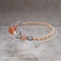 縞模様のサードニクスを中心に、水晶、ムーンストーン(オレンジ色&白)、アクアオーラを通したブレスレットです。