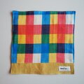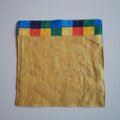 からし色のリネンとチェック柄のダブルガーゼを組み合わせた20センチ四方のハンカチです。