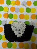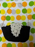色は黒地にアイボリー色のレ━ス模様の蓋を編み付けました。日用品、スマホも入る大きさで便利。
