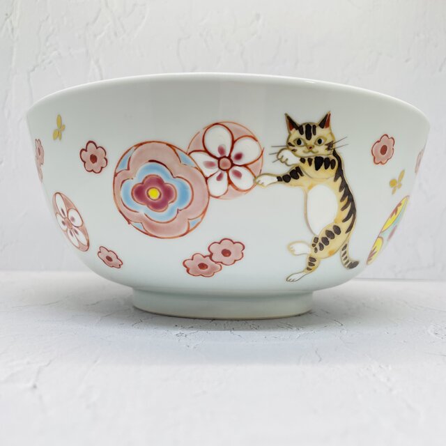 磁器のボウルいちめんにハチワレさん、茶トラさん、キジトラさん、アメショーさん4匹があそんでます。
