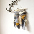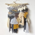 落ち着いた色味ながらスパイスカラーのマスタードや、モヘア、コットン、ファンシーヤーンなどの色々な素材も含め、個性もあるタペストリーですので