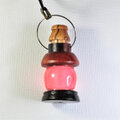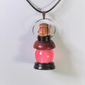 ランプのホヤ部分にはピンク色のレジンを使っています。ガラスや金属よりも軽いので首から下げても疲れません。レジン部分の内部にはミニガラス瓶が埋め込まれています。傘(ランプシェード)部分の上にある「栓」はシマウマ模様が面白いゼブラウッドを使っています。この栓が簡単に落ちないように筒状の部分にラバー塗料を塗っています。