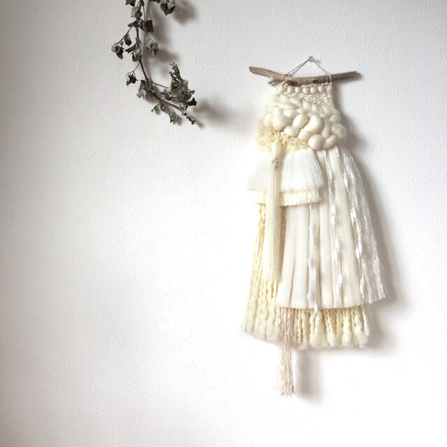 上質なメリノトップウールとクロスブレッドをメインに、きらきらひかるリネンの大粒ネップヤーンや真っ白なシャギーヤーン、キャンディーヤーン、モヘア等、様々なホワイトの素材を組み合わせ、細部にまでこだわり織り上げた世界にひとつの一点ものです。