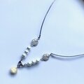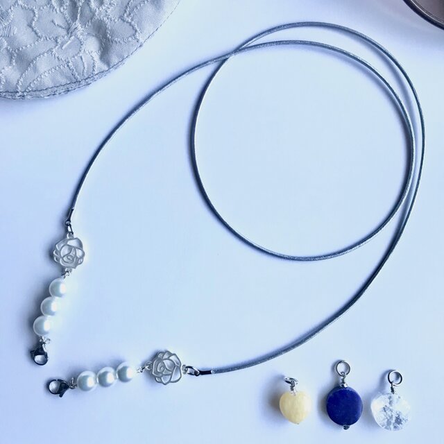 紐は国産丸革ヒモで光沢のあるシルバーカラー、アクセントにパールとマットシルバーの薔薇のチャームを組み合わせ仕上げました。