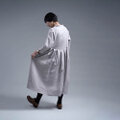 着た感じは少しゆったり目でした。着丈はスネの半分より5~6cm程下くらいでした。袖丈は7分丈くらいです。首回りは余裕のあるスタンドカラーといった形です。肩、腕回りは動かしやすかったですが、余裕はあまりありませんでした。割とピタッとしている印象です。シルエットがエレガントです。