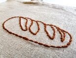 ベージュのトートバッグに茶色のパンを手縫いのバックステッチで丁寧に刺繍しました。刺繍の裏側は引っかかりがない様に接着芯を貼っています。
