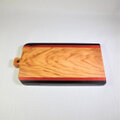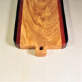 作品はカラフルな銘木を組み合わせたモダンなデザインですので、サービングボードとして使ってもキッチンやリビングなどで映えます。表裏はありませんので両面使えます。 小さめのハンドル部に穴を開けていますので紐を通して吊るすことができます。形を整え研磨してエゴマオイルで仕上げています。