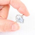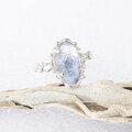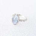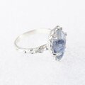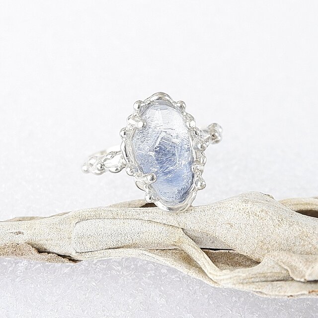細かなブルーの針状デュモルチェライトを内包した水晶を、粒飾りの華奢なリングに仕上げました。
