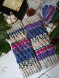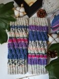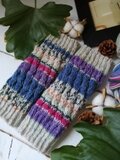寒色系のネイビーや紫やピンクをネップ入りの白でふちどった、手編みの短いスパイラル編みレッグウォーマーです。