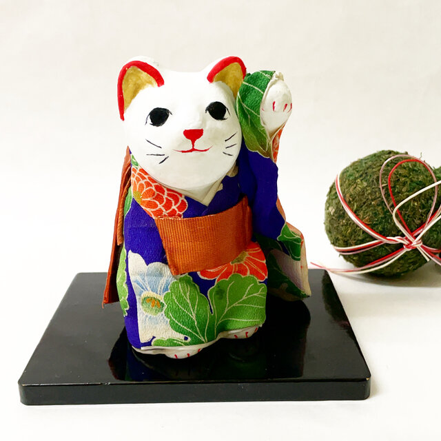 着物の美しい柄が融合して手に取って思わずにっこりとしてしまうような招き猫が仕上がりました。