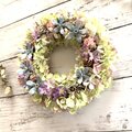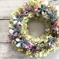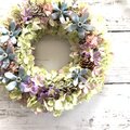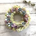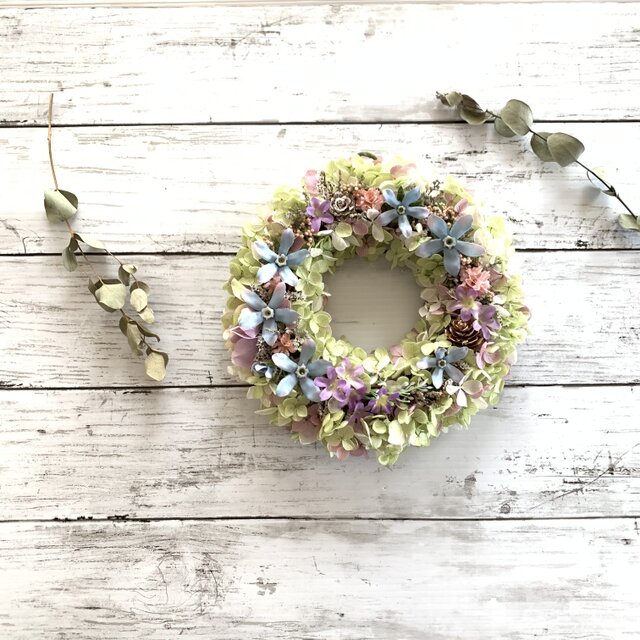 アートフラワーのブルースターとパステルカラーのアジサイを合わせた春にピッタリのリースです。