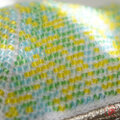 黄色、緑、水色3色のクリアビーズを使用し、鮮やかな編み地に仕上げました。