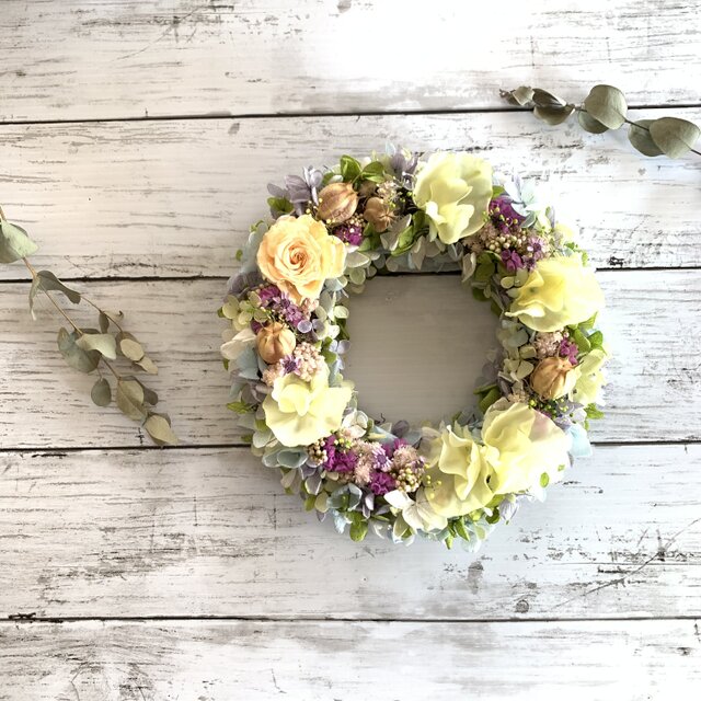 プリザーブドのバラと春らしいスイトピーを合わせた爽やかなイメージのリースです。