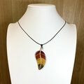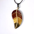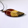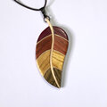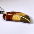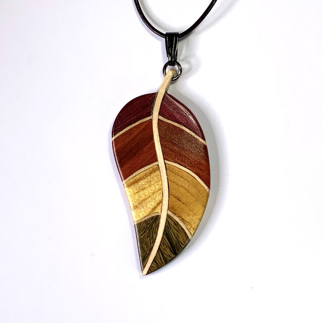 パープルハート、レッドハート、ハゼ、パロサント、ヒノキの五種の銘木を組み合わせて作った、もみじ型寄木ペンダントです。