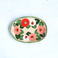 着物や工芸品に描かれている日本の伝統的な椿の模様を、さらにユーモラスに意匠化した紅、白、黄、桃色の椿花と緑葉をオーバルプレートに描き散らした器です。