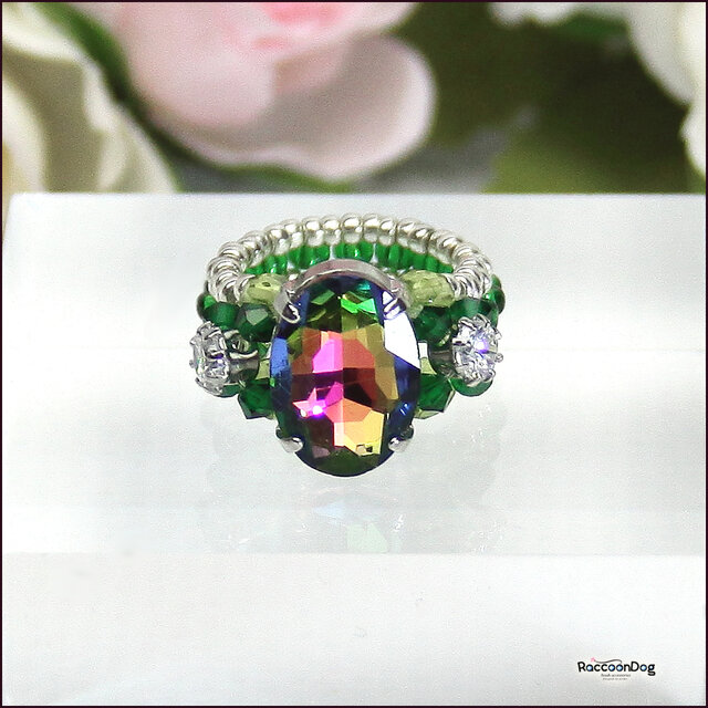 ビーズ,リング,コスチュームジュエリー,ビーズアクセサリー,ビーズリング,ビーズ指輪,虹,ジルコニア,グラスビーズ,スワロフスキー