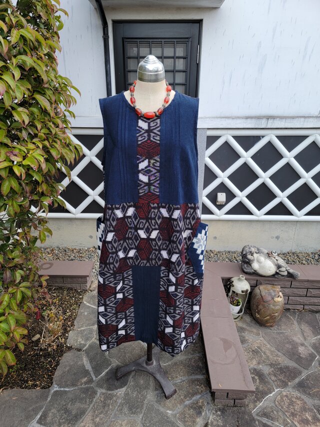 着物リメイク 手作り 久留米絣にポケット絵絣 ジャンパースカート