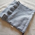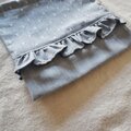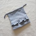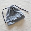 織りドットと同色の糸で作られた無地のダンガリーを合わせて、フリル付きの巾着袋を作りました。