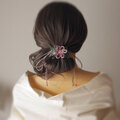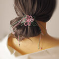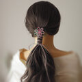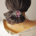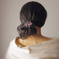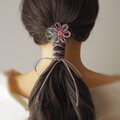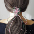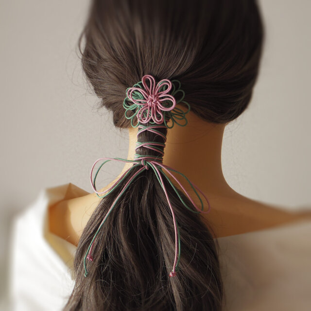 まず最初にゴム部分で髪をまとめ、垂れている紐部分をそのゴム部分の上から巻きつけて使用することにより「和」な雰囲気のまとめ髪を楽しもうと言う趣向で作りました