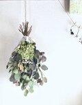 ハーブ畑で育てたユーカリポポラス、アカシアフロリバンダ、ラベンダー、アジサイなどを使った、グリーンなドライフラワースワッグです。