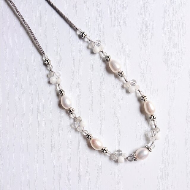 使用パーツ:淡水パール 水晶 ラブラドライト クォーツァイト ムーンストーン メタルビーズ ワックスコード(グレー)