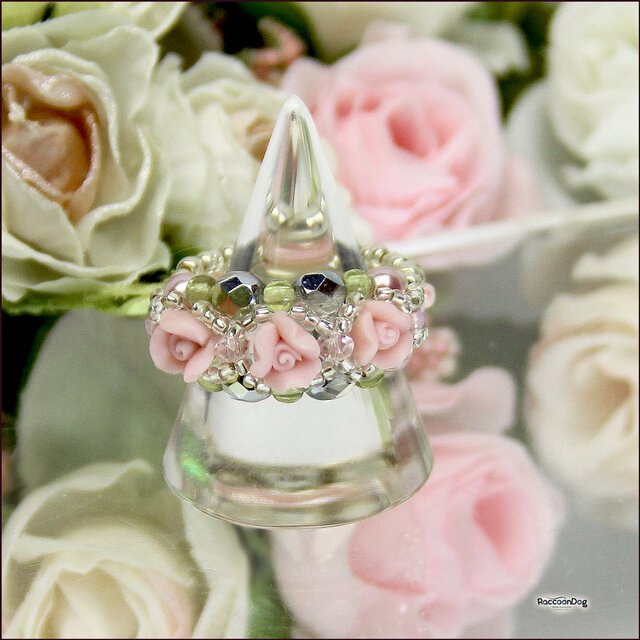 ビーズ,リング,コスチュームジュエリー,ビーズアクセサリー,ビーズリング,ビーズ指輪,花,グラスビーズ,ローズ,薔薇,バラ,ピンク