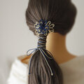 まず最初にゴム部分で髪をまとめ、垂れている紐部分をそのゴム部分の上から巻きつけて使用することにより「和」な雰囲気のまとめ髪を楽しもうと言う趣向で作りました