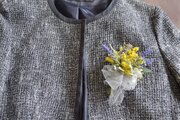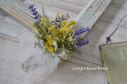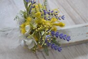ミモザとラベンダーを束ねたようなブーケ型コサージュ。
