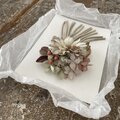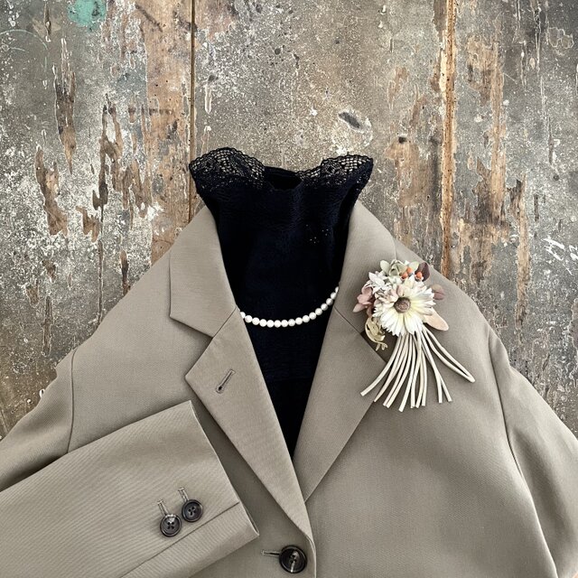 素敵なコサージュが届きました 小さなスワッグみたいでかわいく、いろいろな素材が使われていて眺めているだけで幸せな気持ちになります ありがとうございました
