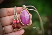 ◆このたびはキャラメル、ヘンプ色の蝋引き糸を使用しマクラメ編み装飾を施しました。