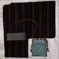 その技術を生かし、現代の日常で長く使っていただけるように素材はコットン紬風グリーン地を選び、焼箔の青貝箔をミックスに貼り交ぜ加工しました巾着型のショルダーです。