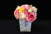 空をイメージした青いオリジナルボックスに爽やかな色味の花をあしらったアレンジメントです。