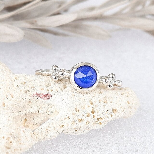 ラピスラズリとクリスタルクォーツ(水晶)を貼り合わせて作られたルースを、華奢な粒飾りのリングに仕上げました。