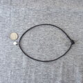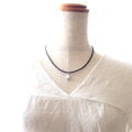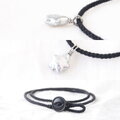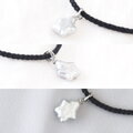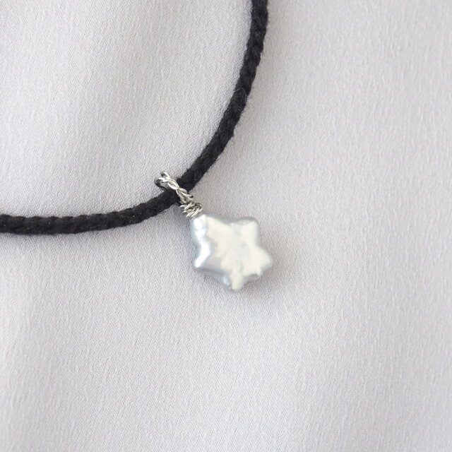 ブラック色の綿の糸を編み込み、照りの美しい星の様な形をしたシルバー色の淡水パールをトップに配したシンプルなペンダントです。