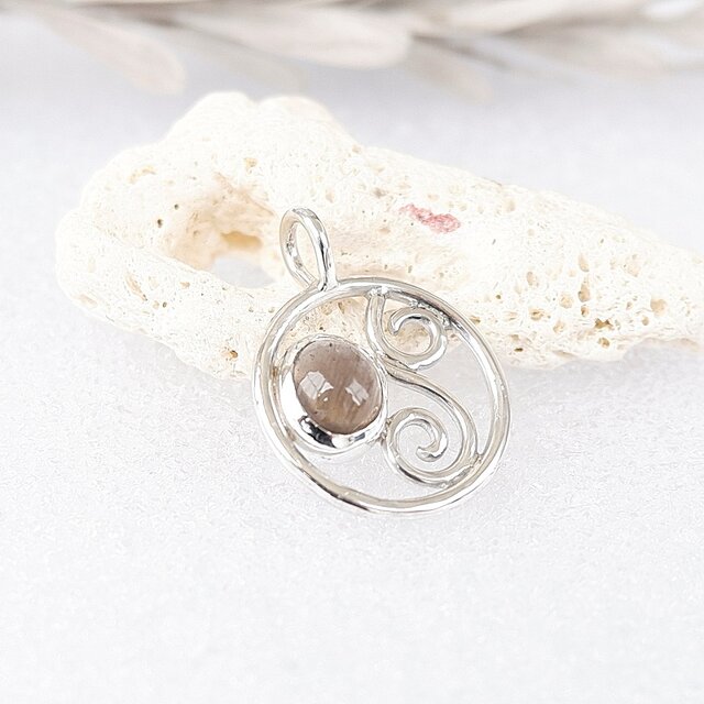 インドネシア ジャワ島で産出するアグニマニタイトの原石を磨いて、唐草デザインのペンダントに仕上げました。